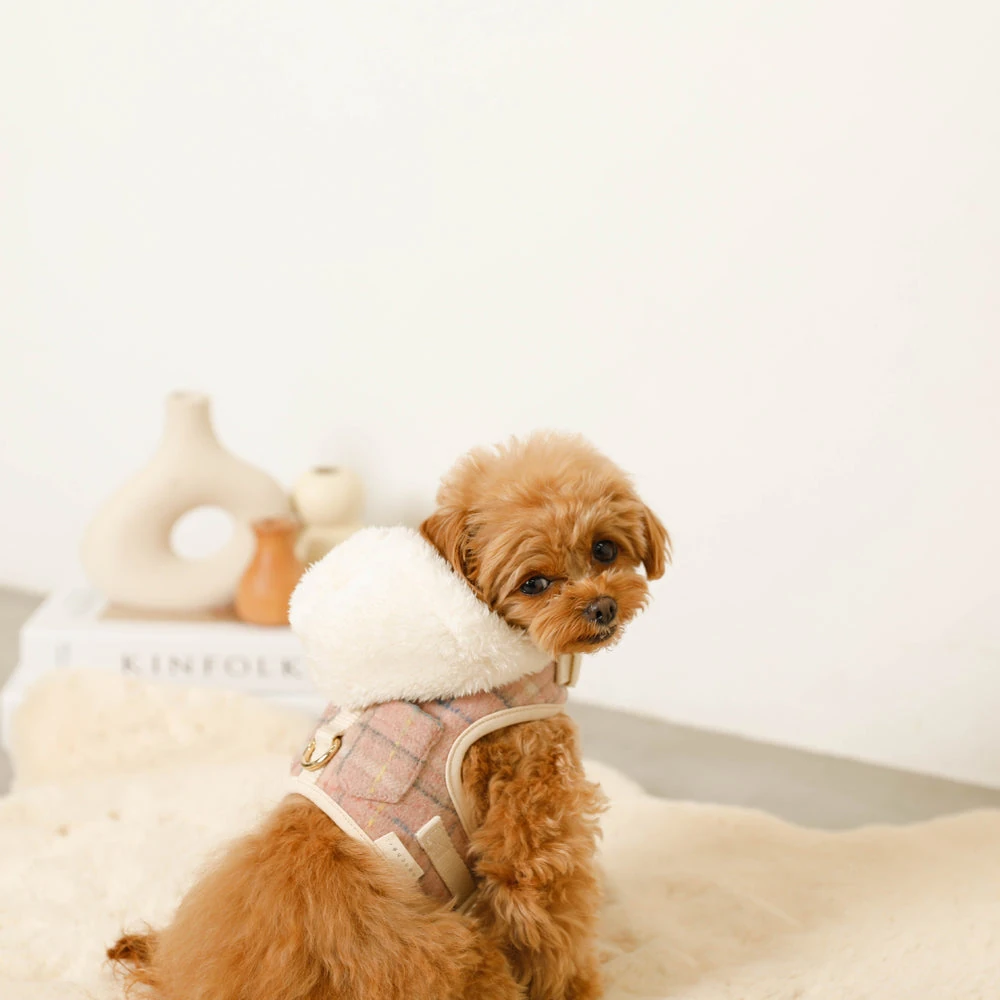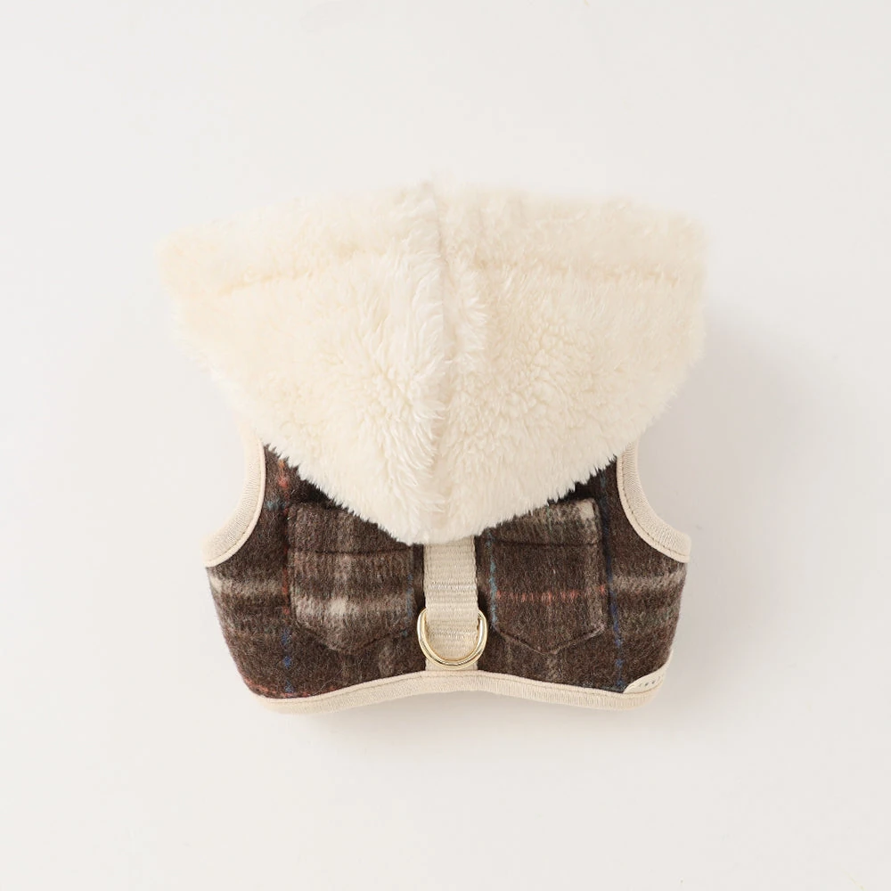 ファーフード付チェックハーネス+リードSET【名入れ刺繍対応】