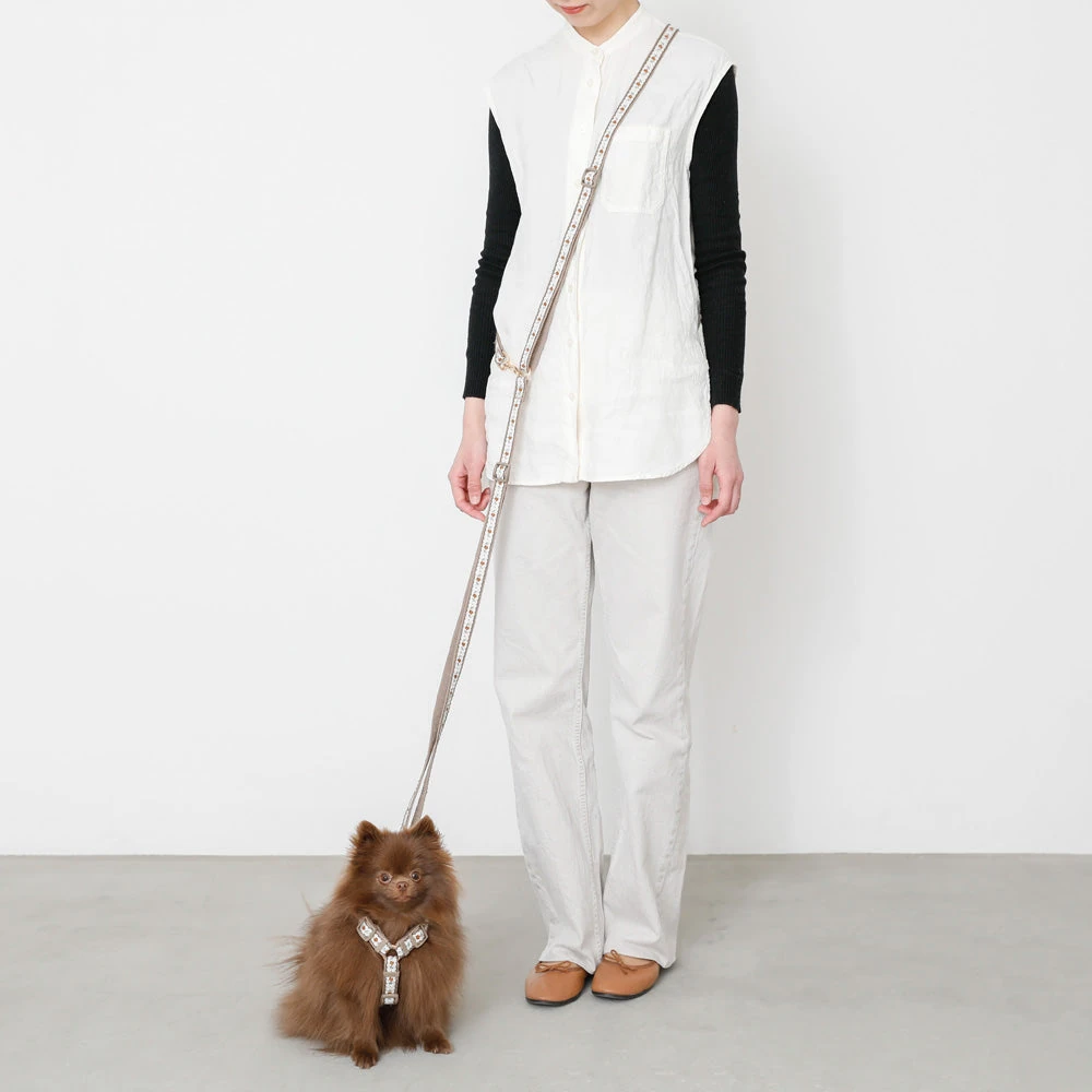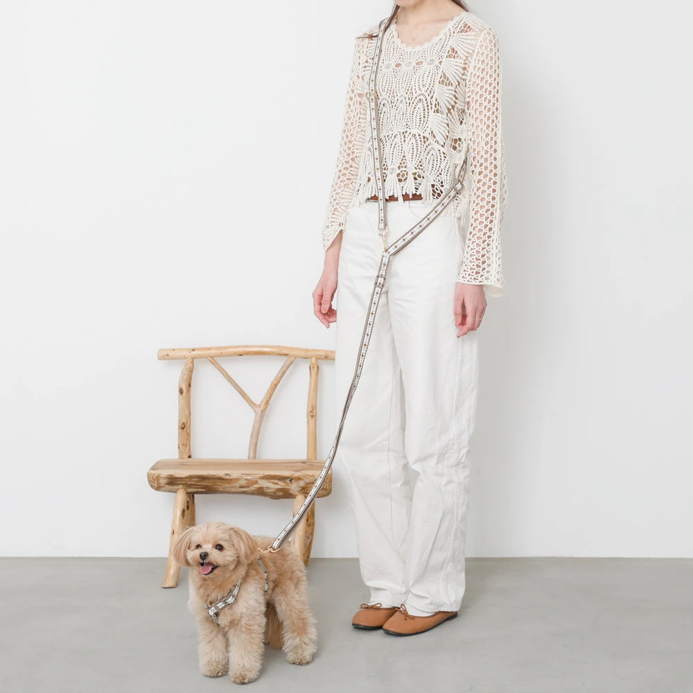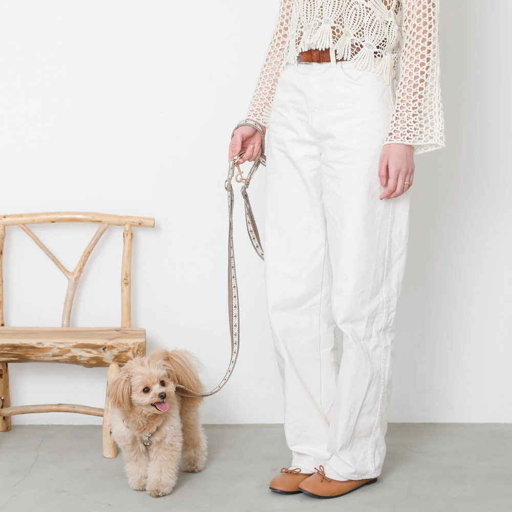 当製品の最大の特徴は、美しいフラワーモチーフと実用的なテープ形状のリードを組み合わせた点にあります。従来のチェーンリードや紐状リードとは異なり、平たいテープ形状が手に優しくフィットし、長時間の使用でも手の疲れを軽減します。